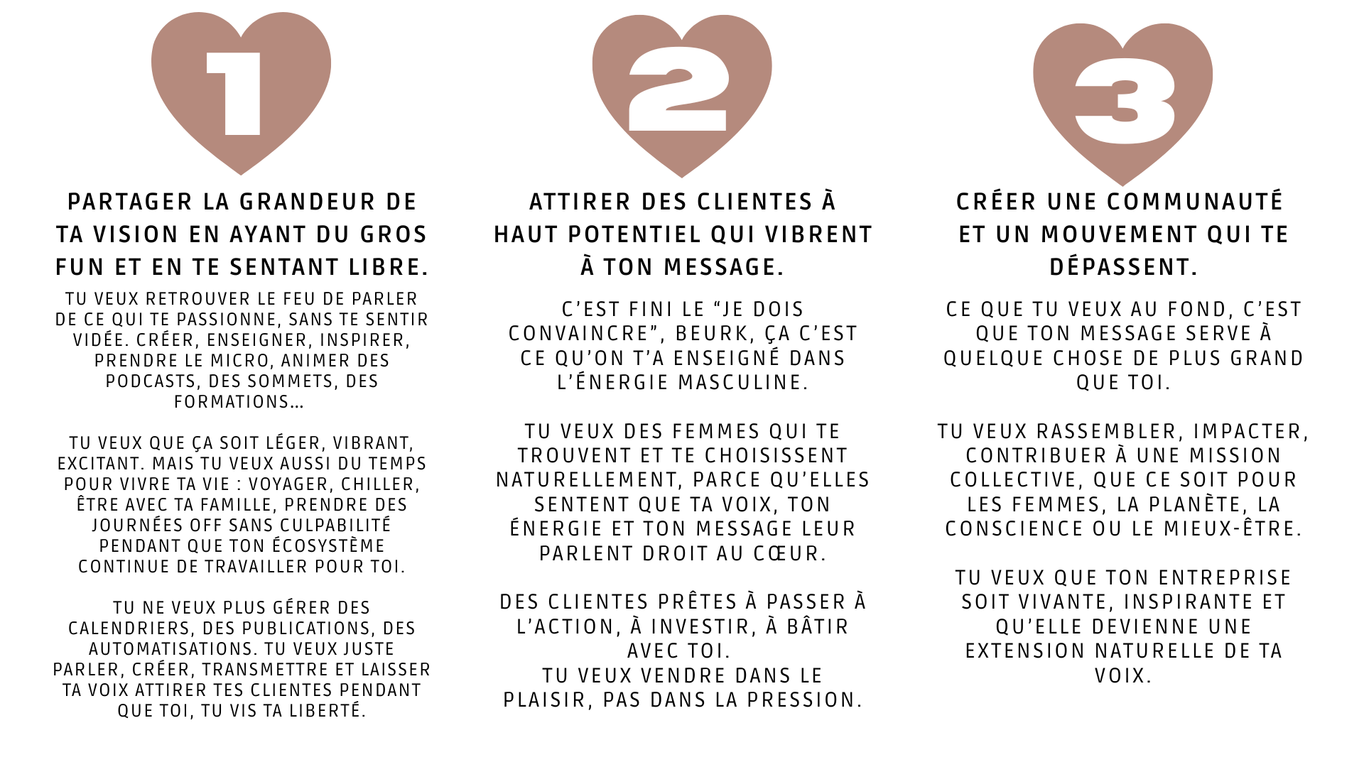 Ce programme, c’est pour les coach, formatrices, thérapeutes, artistes, entrepreneures de service et leaders visionnaires qui savent qu’elles ont une voix à faire entendre.
