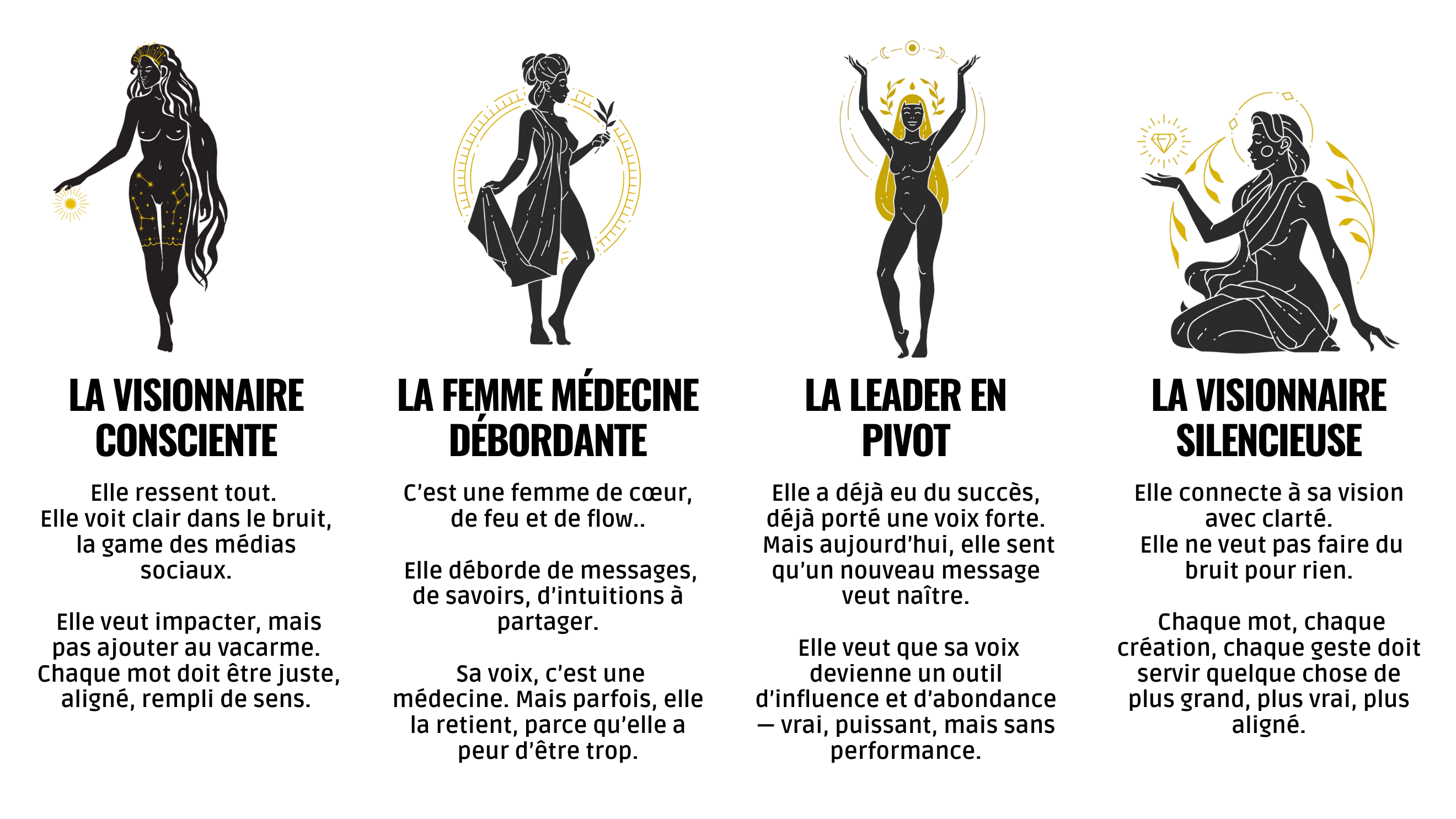 Le Club des Oratrices Visionnaires t’ouvre les portes de 4 portails initiatiques, chacun représentant une facette essentielle de la voix d’une femme influente :